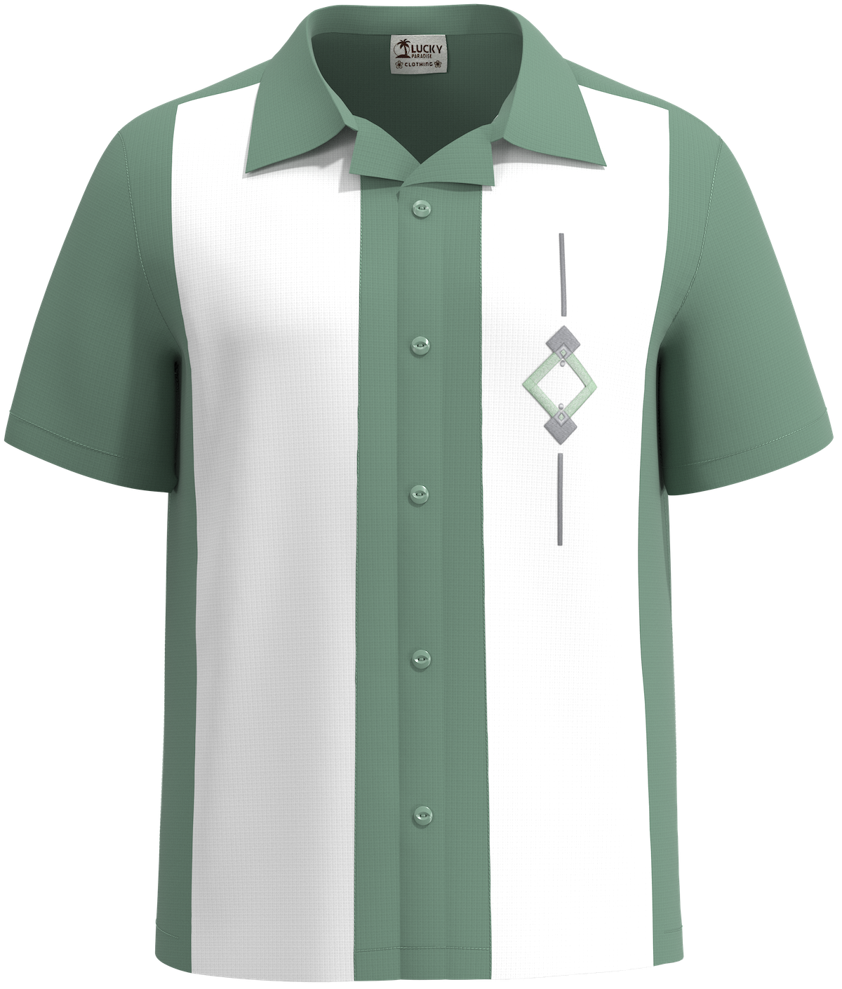Transport yourself to the golden age of the Havana lounge with The Vedado by Lucky Paradise. This vintage green and white button down features a rich, verdant body accented by crisp white panels. It is a masterclass in tropical modernism, offering a sharp, tailored silhouette that feels right at home under a palm tree or in a historic cocktail bar.