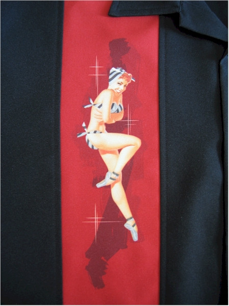Mens Black with Beautiful PinUp Girl Printed Red Single Panel, Left Chest Pocket, Button Up, Pin Up Girl Shirt. This stylish 40's pinup shirt is a fabulous addition to your wardrobe.