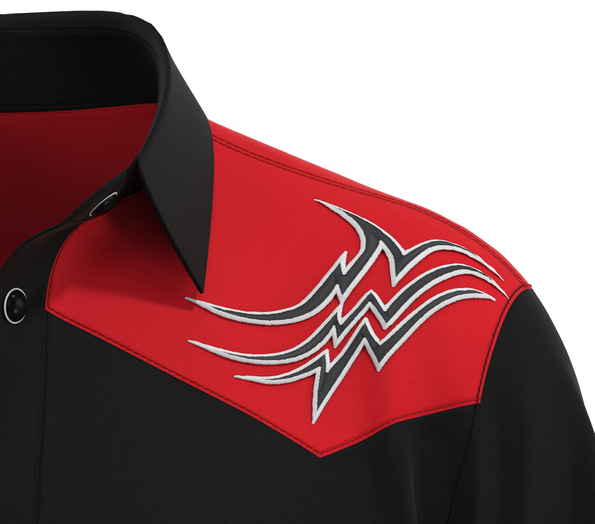 The Fiery Ink Rockabilly Shirt is a blaze of cool for the rebel who lives with a spark in their step. The perfect bridge between Kustom Kulture and the rockabilly scene. Featuring tribal flame embroidery on the yokes, this black and red western shirt is built for the garage and the mosh pit.