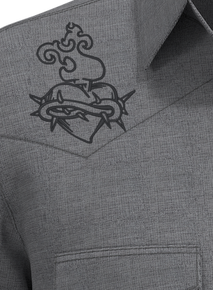 Alright, retro bowling rebels and rockabilly renegades, it’s time to set the lanes on fire with the "Sacred Heart Rocker" Western Shirt—a grey, 100% polyester silk-like smoother stunner that’s got more soul than a jukebox jammin’ at midnight! This ain’t just a shirt; it’s a tribute to the fiery Sacred Heart logo blazin’ on each yoke, radiatin’ passion and rock ‘n’ roll grit. Make it your own with custom embroidery—your initials, team name, or a slick rockabilly phrase—stitched on the left chest or back to crank the rebel vibe to eleven.