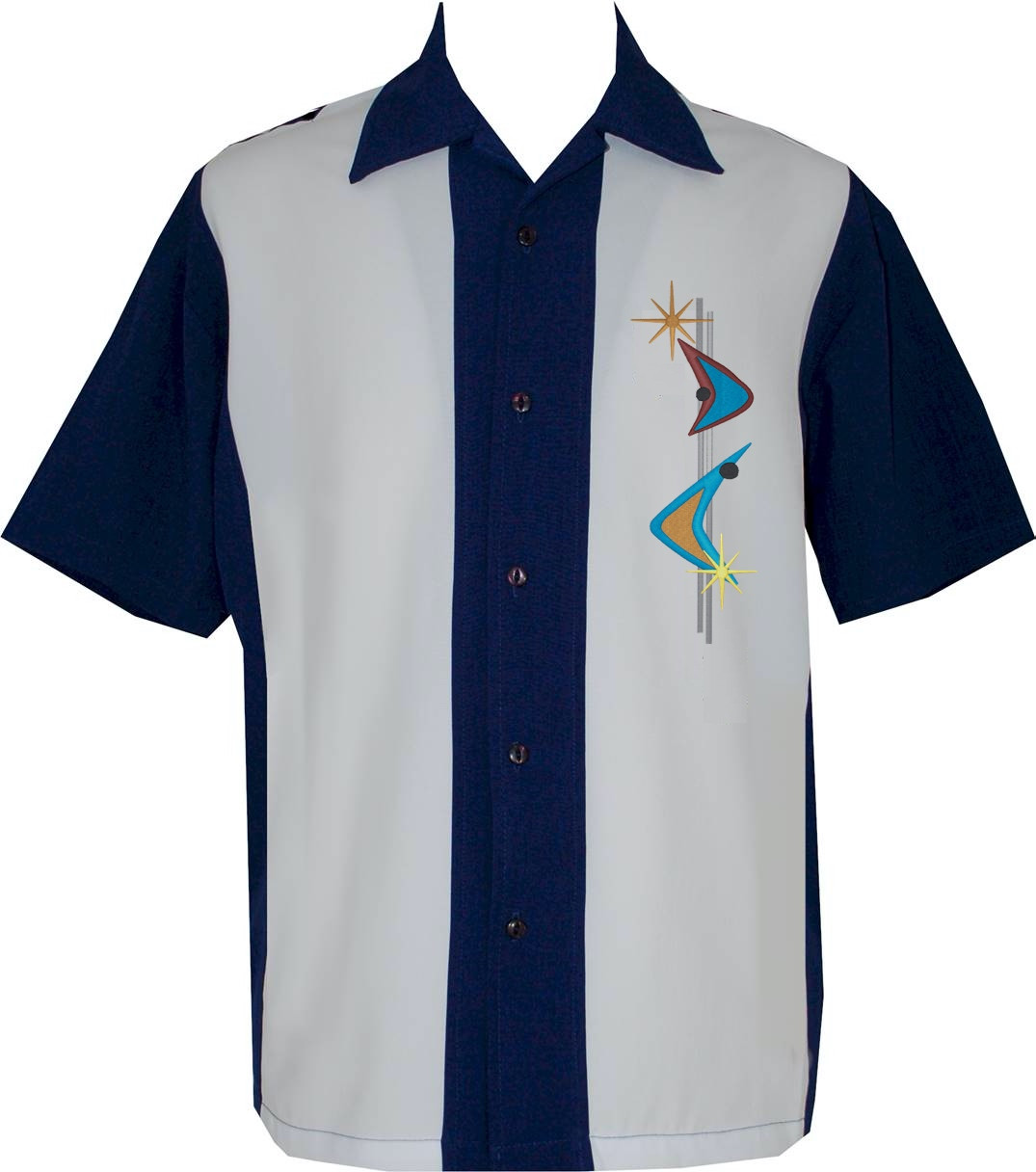 -- Embroidered Atomic Mid-Century Design on Left Chest