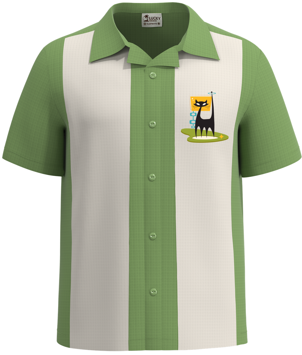 • Summer Design: Apple green with soft cream with an atomic cat that says vintage Bowling Shirts got a fun twist.
