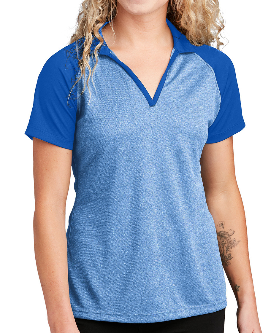This is a cool womens athletic bowling shirt! This figure-flatter shirt moisture-wicking polo combines black and matching tonal heather RacerMesh fabrics for a truly modern team look..